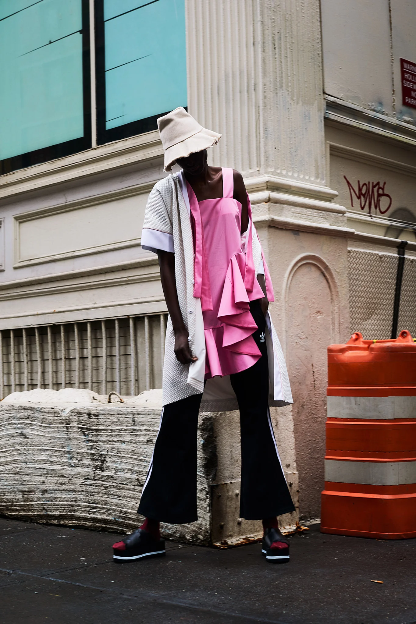 Senegalese model Amy Faye hits the streets of New York in the season’s rule breaking, over-layered silhouettes