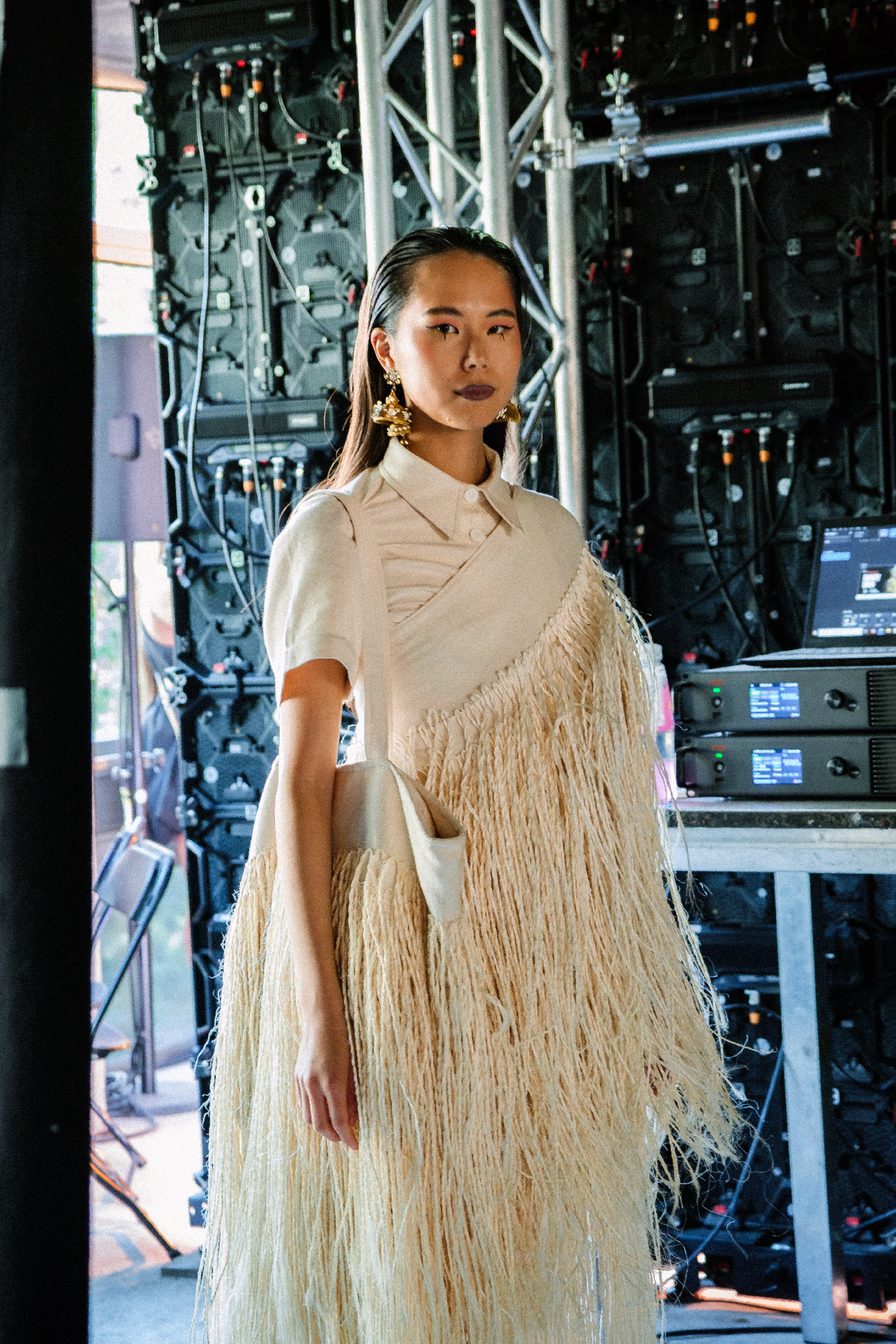 Then it was onto the catwalk space. Sevaria by Kenyan designer Jamie Bryan Kimani opened the show with a collection crafted from richly textured, handwoven sisal and cotton textiles. Fashioned into structured, unisex pieces in olive and cream, a biker jacket, sleeveless jacket, shorts and shirts were accentuated by silver chainmail and long fringing. A standout leather short-fringed hourglass gown swept to the floor, completing an accomplished and elegant line-up.