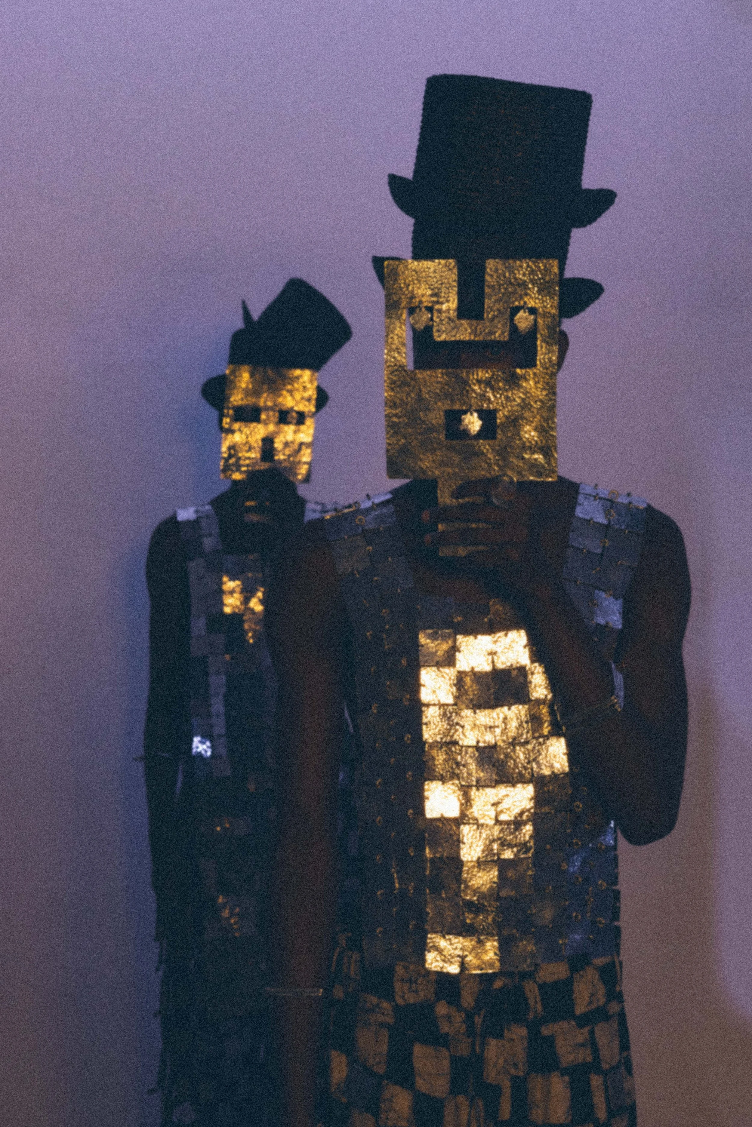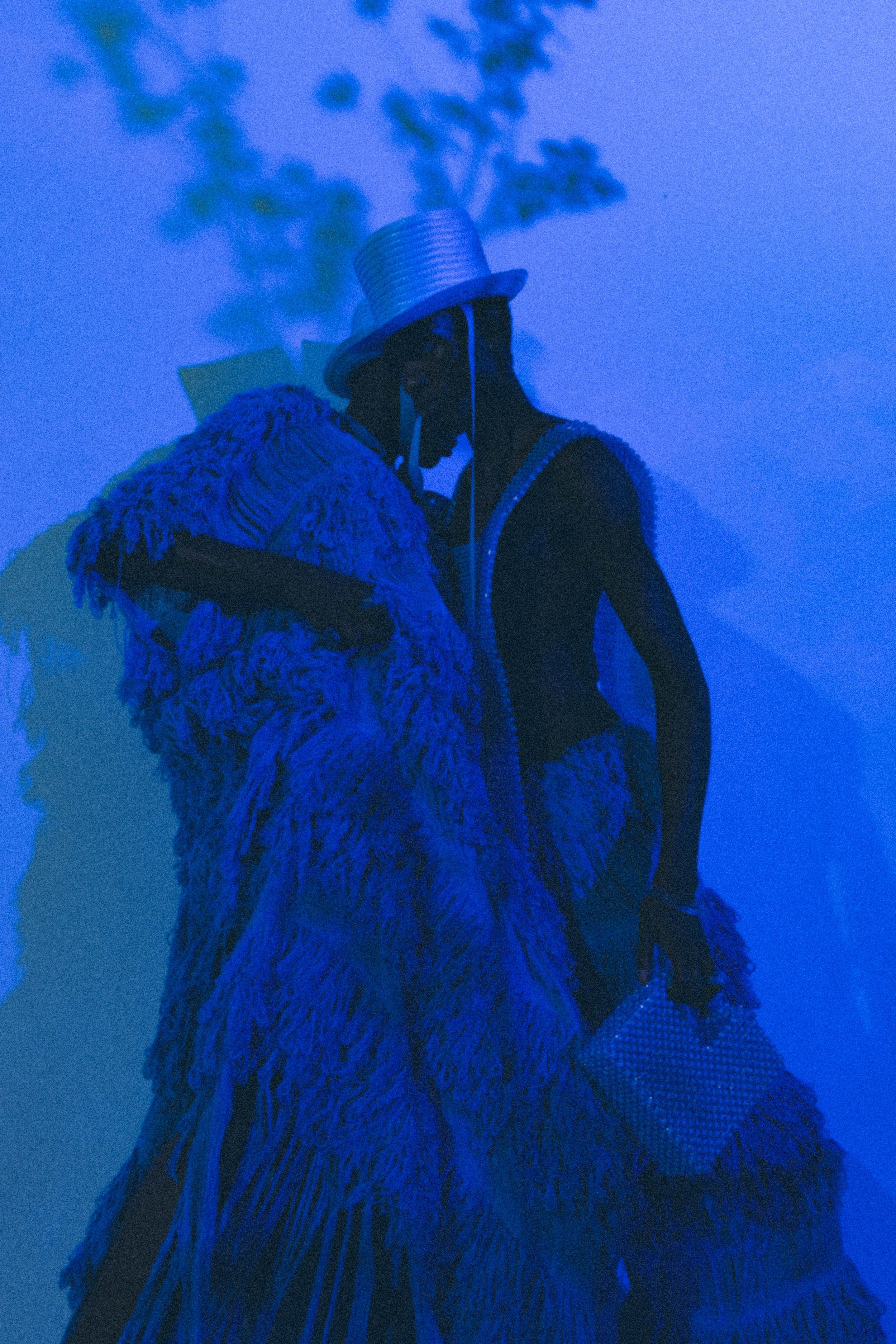 Here, Nataal debuts the season’s campaign film, directed by fellow Nigerian artist Daniel Obasi. The visual narrative is told in the shadows, a lidden borderland where glistening masks, folded capes and towering hats are imbued with a luminous emotion.