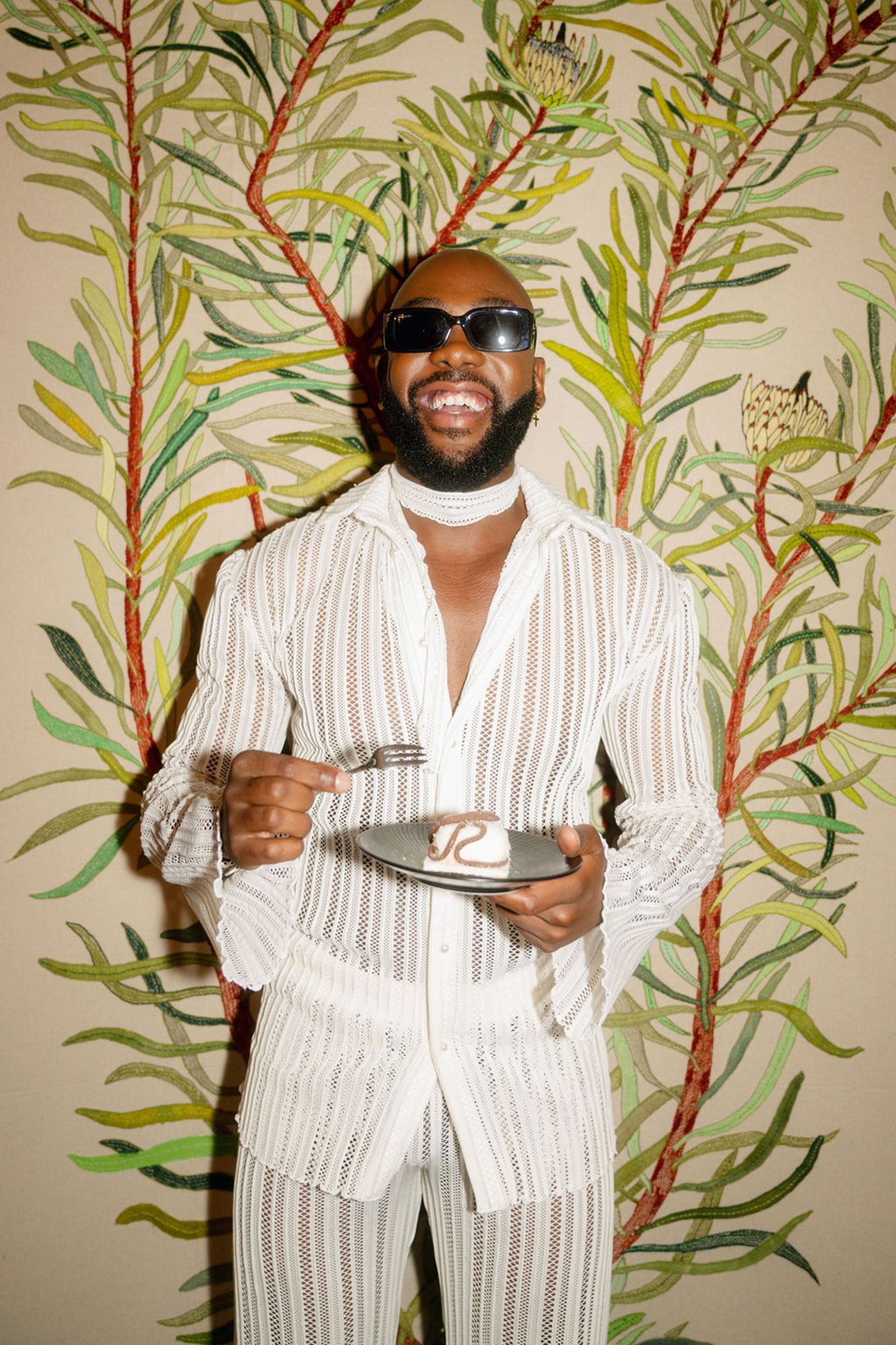 Adeju Thompson of Lagos Space Programme, a regular at Paris Fashion Week, chooses to make his South African debut with a show that draws from the label’s past three seasonal collections to introduce his queer eye on Yoruba and European dress codes to a new audience. The mood is regal yet fruity, with shirts cut to the navel and cowboy trousers with jockstrap detailing alongside blouses and skirts in post adire silks. His heavenly textures, from tufted wool overcoats to beaded bags that cascade to the floor, exhibit his dedication to Nigerian handcraftsmanship. “This is a pivotal moment in my career so it’s interesting to reflect on my journey by bringing these collections together to tell a new story,” Thompson tells me. “Fashion is so fast. It’s always, ‘What’s next?’ but here I’m allowed to exist in my own multiverse. I design from a vulnerable space to create my own version of what Nigerian fashion is.”