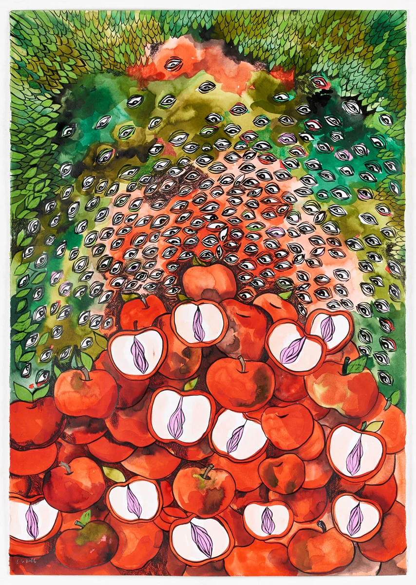 On the other white walls of the gallery hang equally bright and mystical beings reclining against the night sky, or prints of ripe and juicy paw paws, apples and more bananas, which mingle with phallic shapes. The first impression is one of decadence and intoxication but look closer at some of the titles of these works, such as Cut-Cut Kill-Kill Stab-Stab – A South African Love Story, and a more real world reading hits you between the eyes. What at first seems saucy soon reveals itself to be a passionate exploration of gender roles, sexual violence and the objectification of the female body in contemporary South African society.