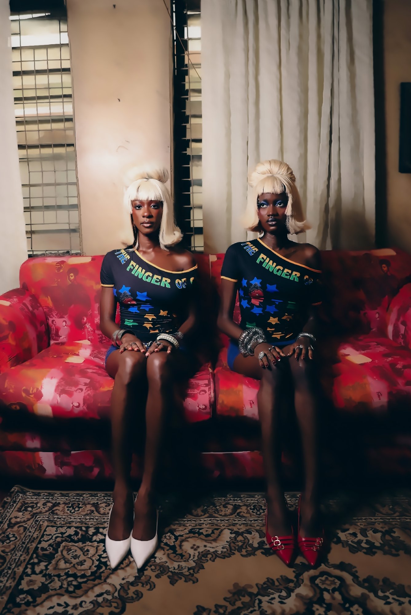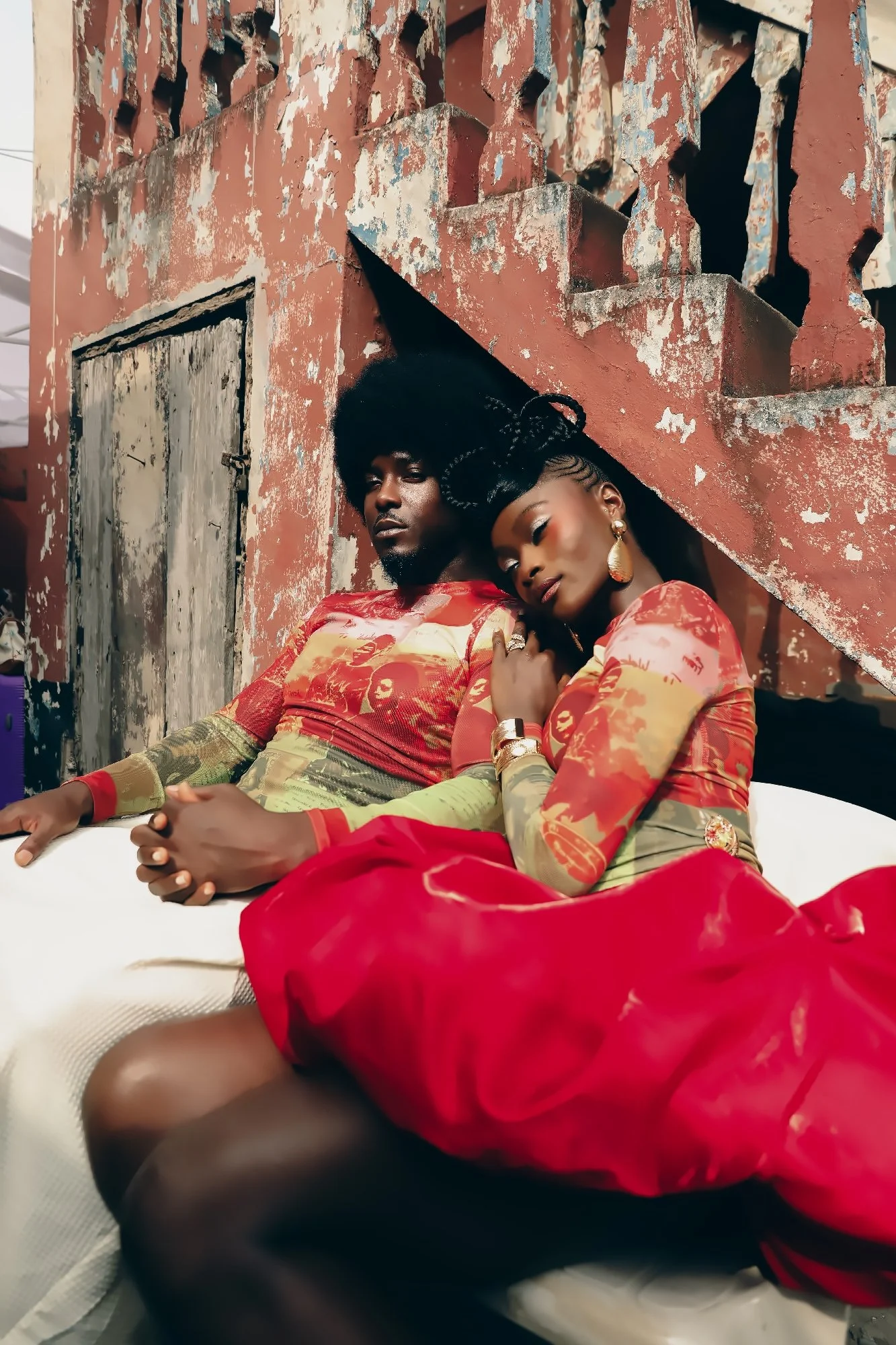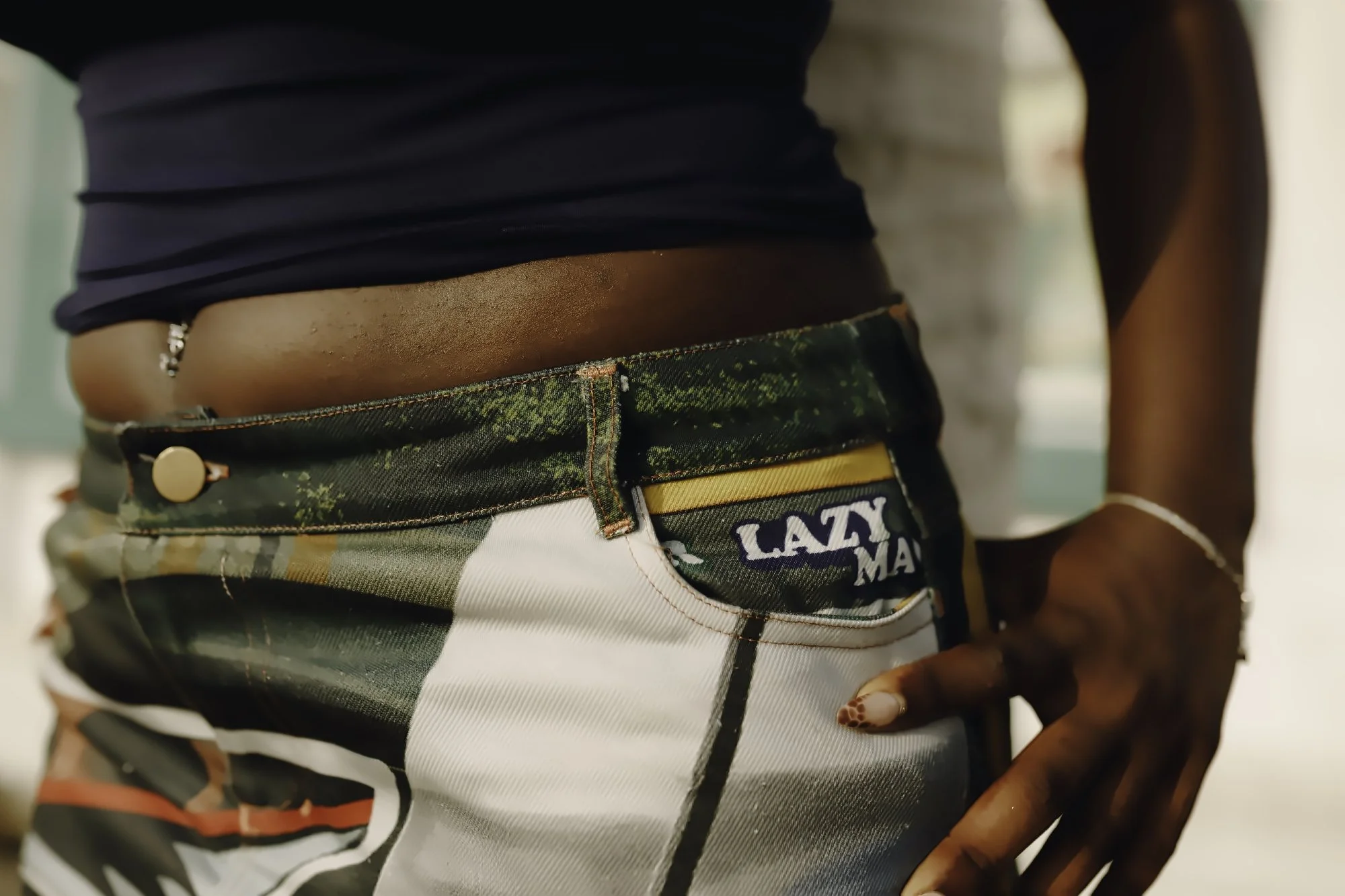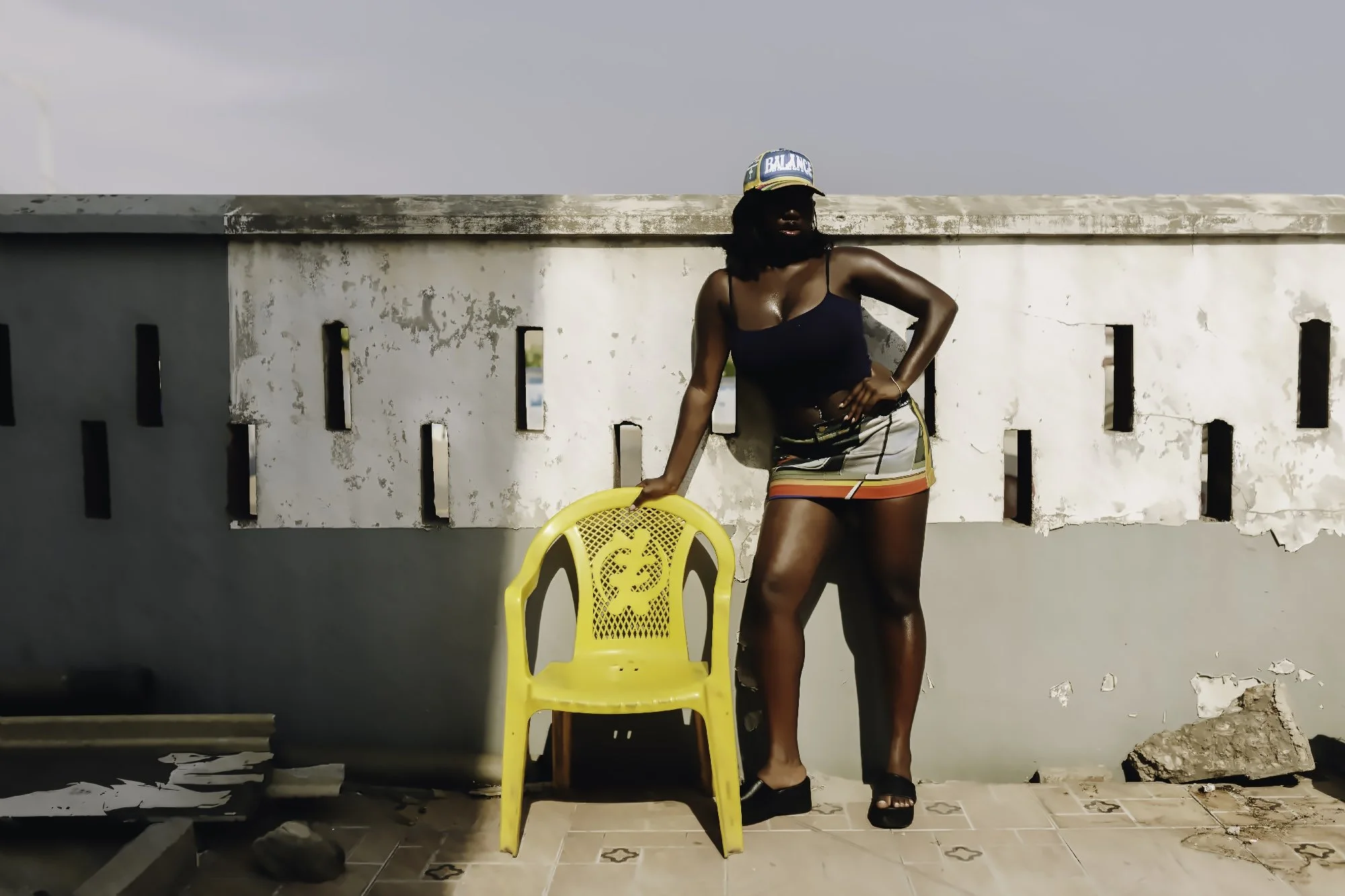 The idea of preservation carries on throughout the collection. The Color Riot T-shirt draws from the colour palette of OMO packaging referencing laundry days and domestic routines. The same visual language appears in the film through a scene of washing clothes outdoors. “We like to have little nuances,” Oye notes. “If you know, you know.” Alongside this, the ‘go-slow’ of Lagos’s congested road network is felt through a collaboration with lens artist Chukwuka Nwobi for the Danfo skirt and hat. These incorporate imagery from the city’s buses and the phrases commonly painted on them such as ‘No food for lazy man’ and ‘Balance’. “Even traffic, I don’t really see it as a burden anymore. I look at it as a source of inspiration,” Oye reflects.