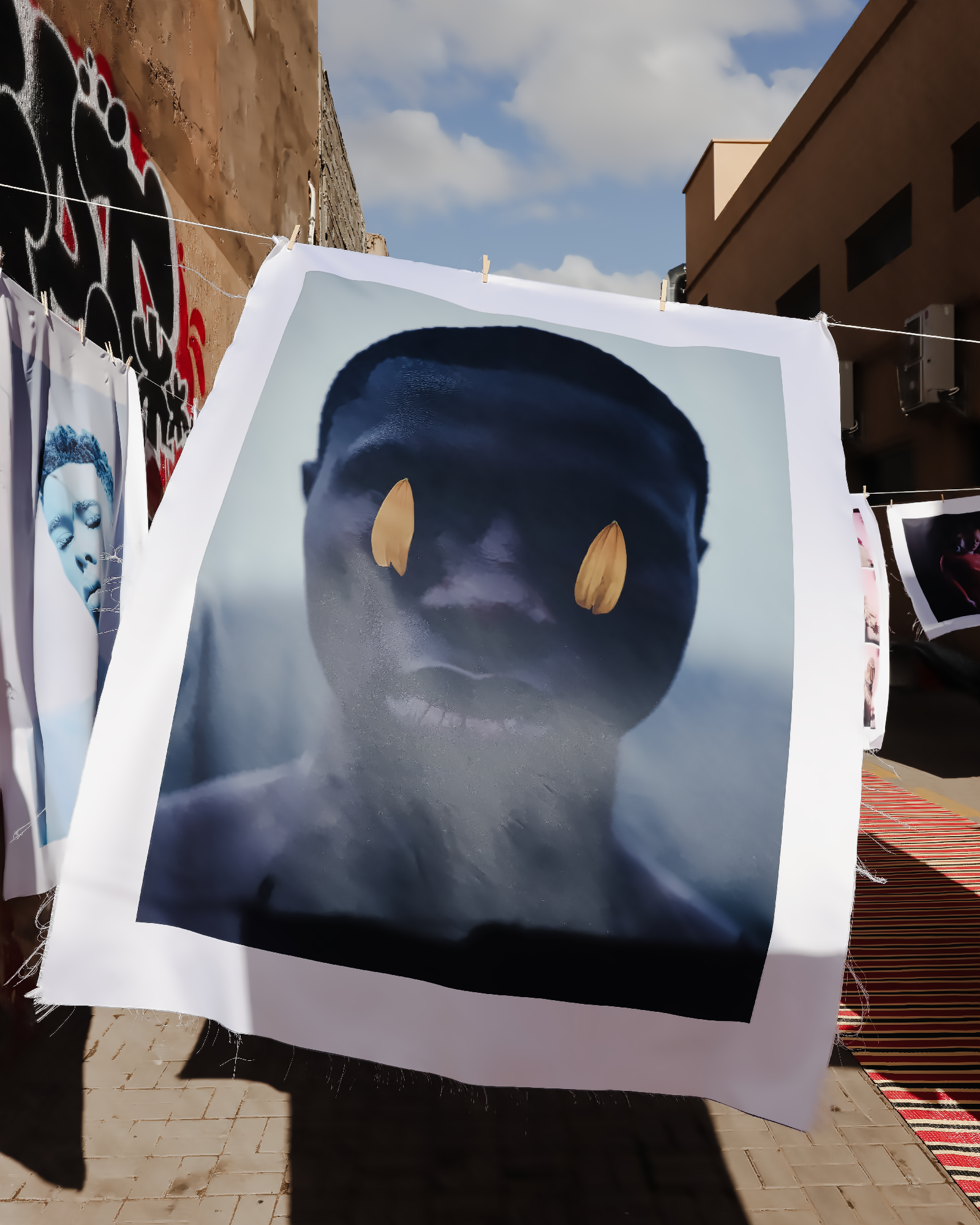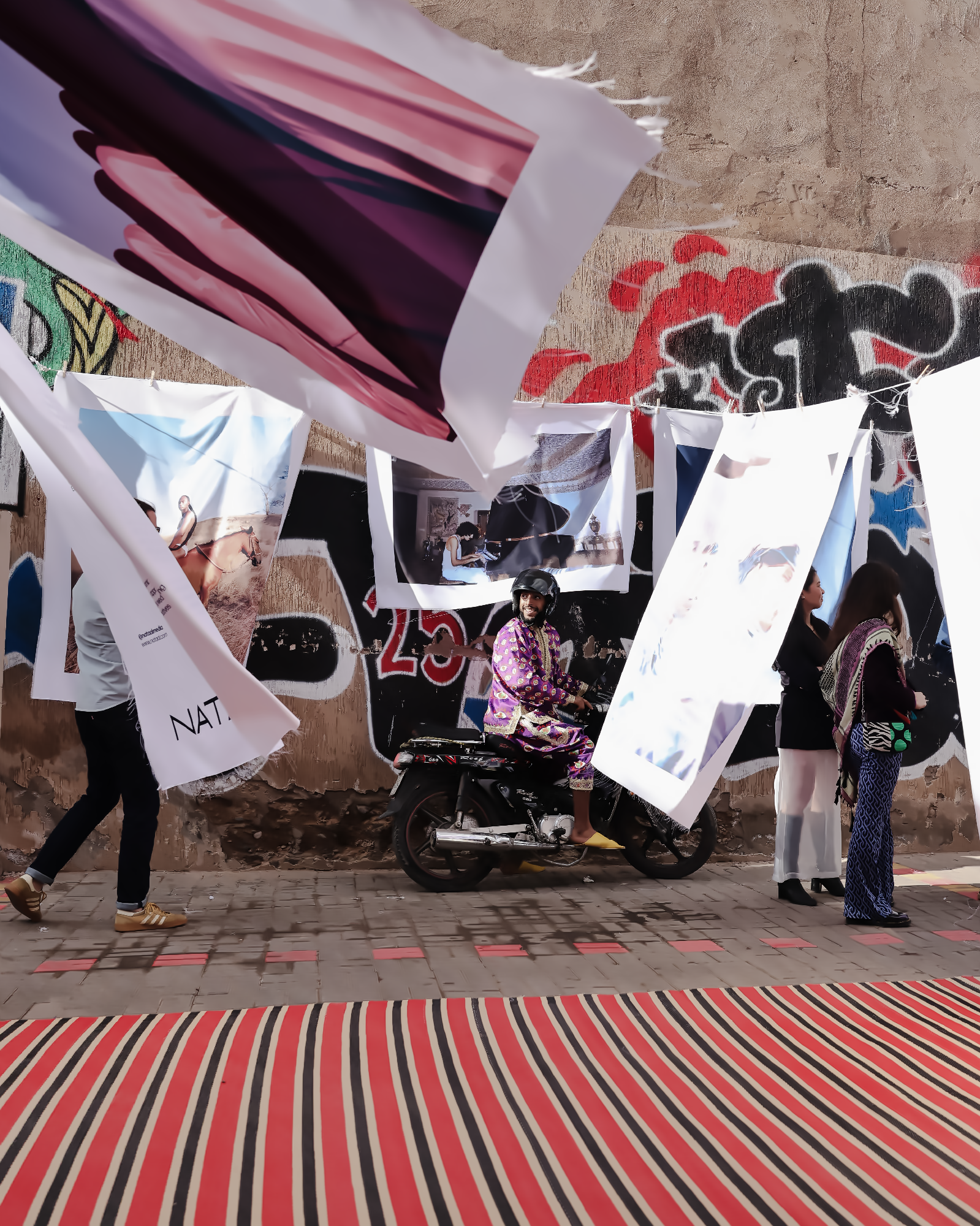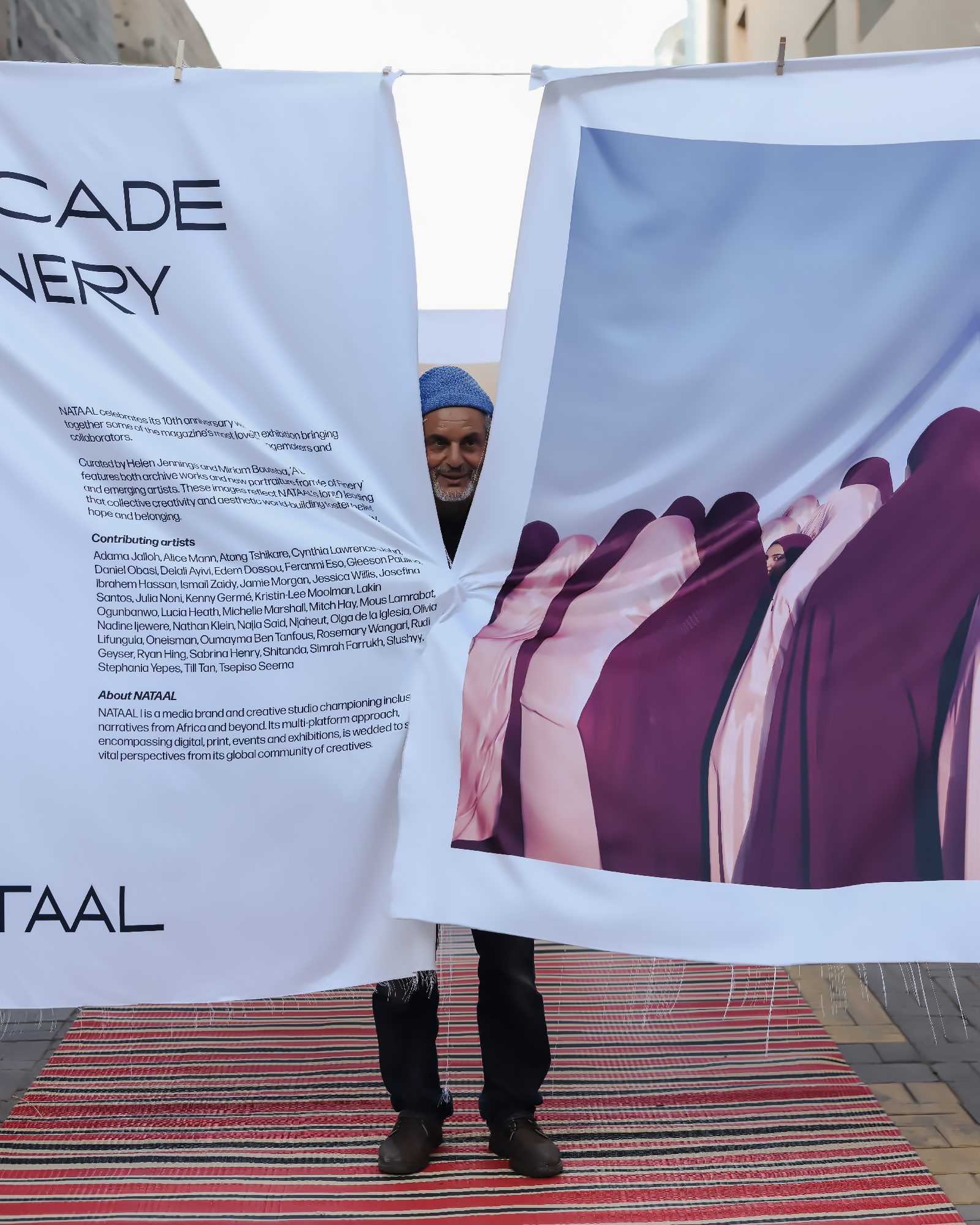Completing the Kech United line-up, NATAAL took over Jajjah’s outdoor space with an installation of 28 photographic portraits from our 10-years-deep archive and representing some of our most beloved contributing artists. Images were printed on silk and hung on washing lines, allowing the spring breeze to bring them to life. These rich and uplifting works floated and rippled across the expansive courtyard where visitors could playfully encounter each one.