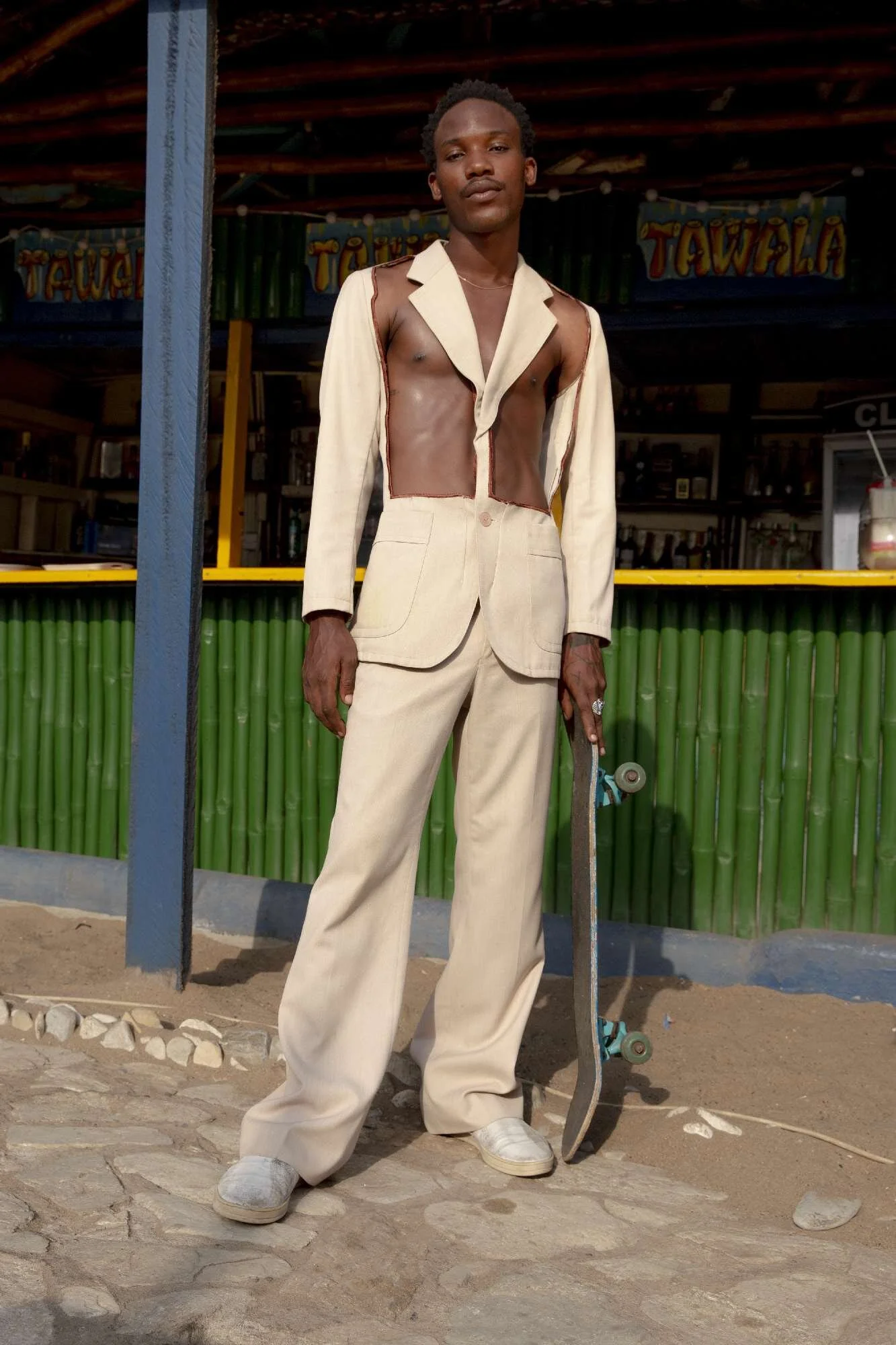 Every piece is made from carefully selected vintage clothing, which has been re-crafted in collaboration with local tailors into Kubi’s one-of-a-kind designs. Looks expose the body in easy ways in order for the wearer look and keep cool. Embellishments hint at the freedom Kubi wishes for the modern African man breaking away from social and sartorial norms. And accessories in collaboration with Italian jewellery designer Gogo Philip add extra flair.