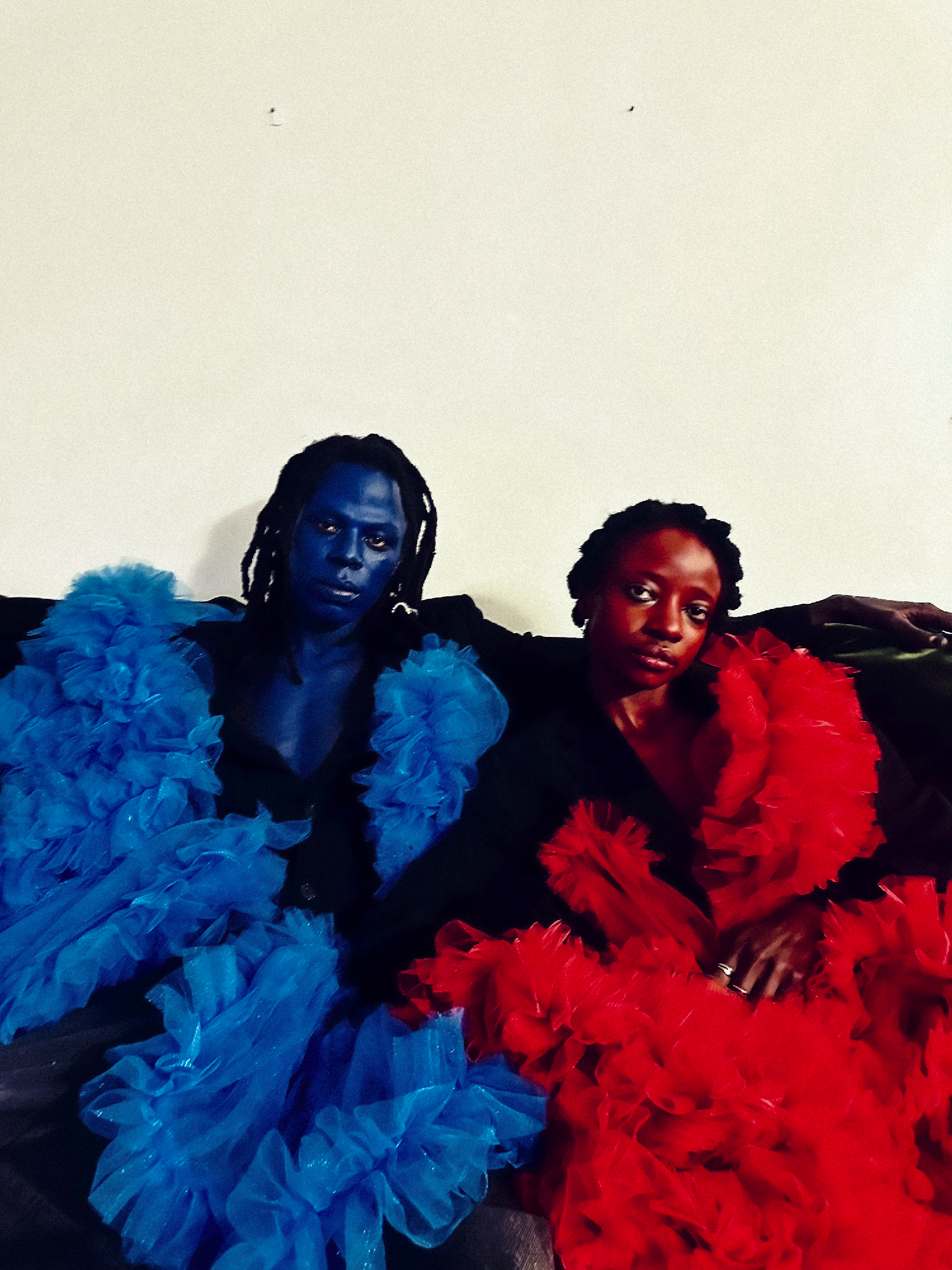 Next, the shoot production turns an apartment in Karen into a working set. A projector beams religious iconography against a wall, jewellery sparkles inside shopping bags, cold brew stocks the fridge. It’s all red and blue war paint, cool-as-you-please cigarette breaks and amapiano floating in the air. Cherry Black, Alexis Nereah, Tony Ngige, Rosemary Wangari, Holyziner and Vinette Khakai know how to play well together. Because as young creatives of growing repute – designers, storytellers, entrepreneurs and vibe curators – they are all tapped into the same frequency.