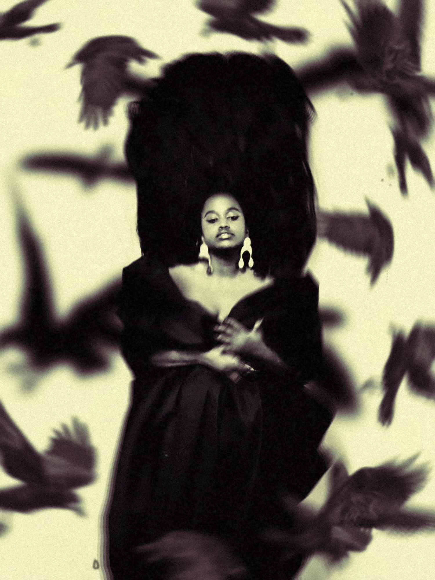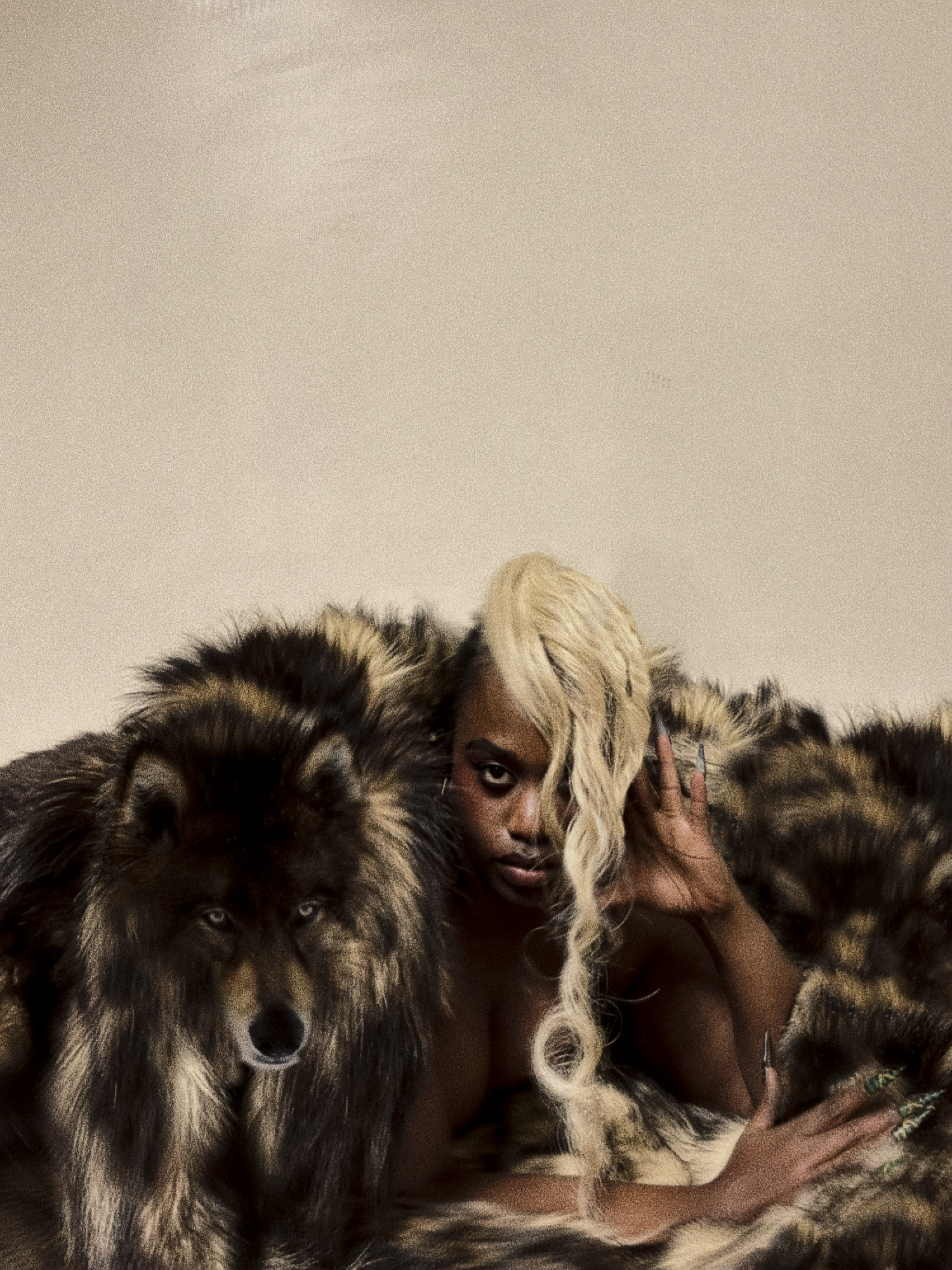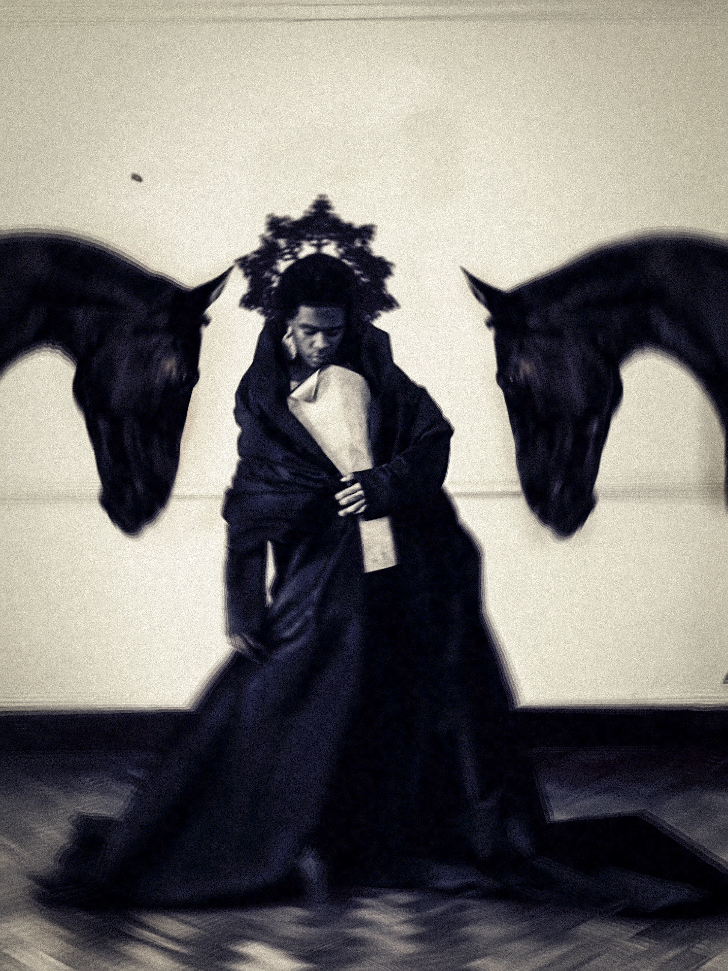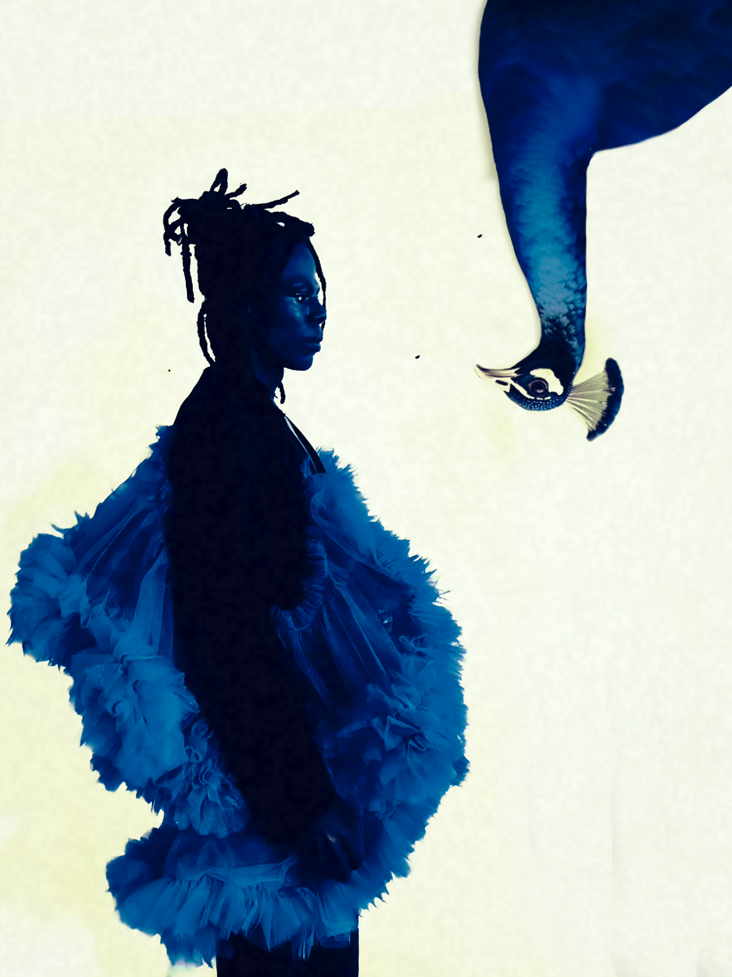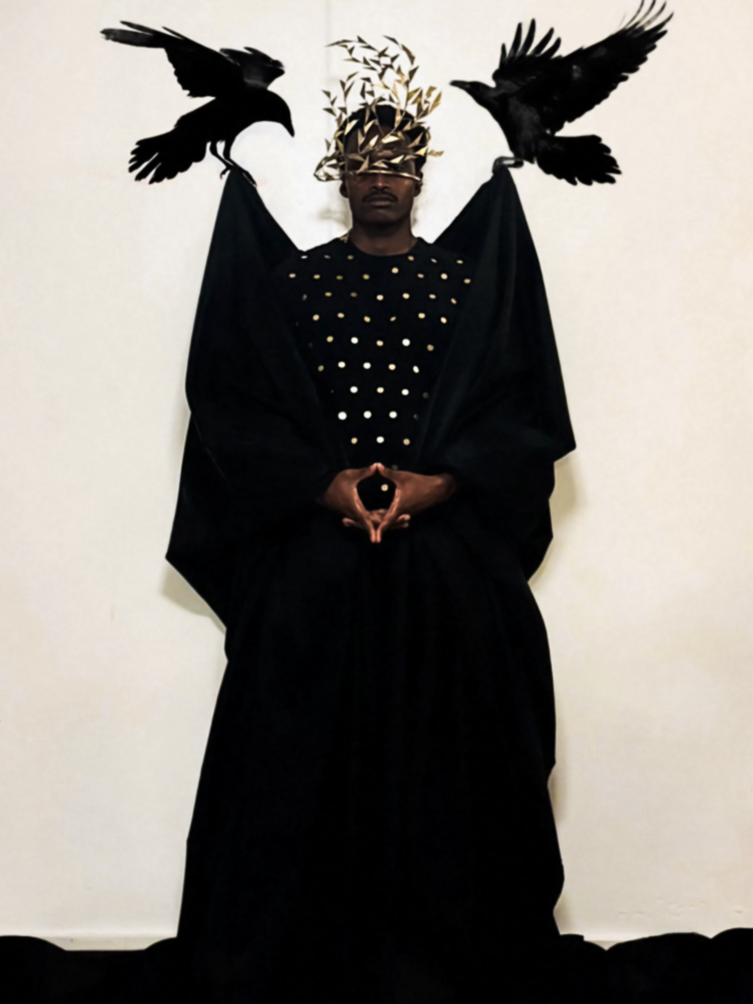 The 28-year-old has developed a particular liking for human-animal portraiture over the course of his five-year career. In 2023, he created ‘Lullabies at dawn’, a mixed media series that produced ‘butterfly people’. This latest exploration brings creature energy in dialogue with human form and fashion. Wolves prowl across shoulders. Horns spring from heads. Ravens swoop all around. “For me, animals carry a raw honesty that humans often mask. Their movements, instincts and presence hold a primal energy that speaks to survival, elegance, and spirit,” he says.