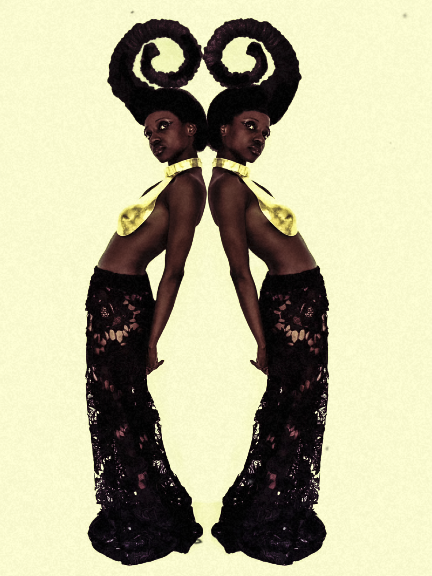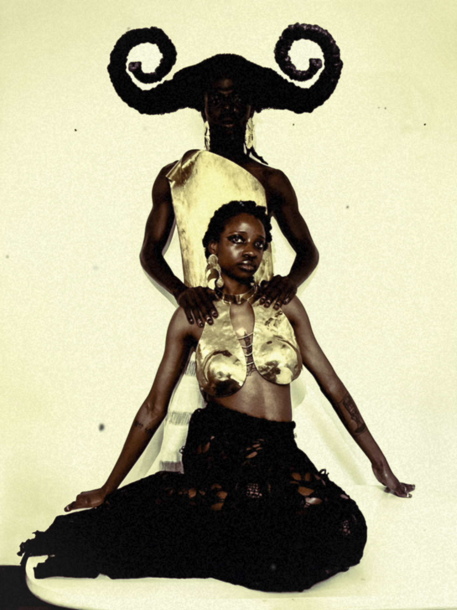 That same stubborn refusal to delineate between creature and man shows up beautifully in Shitanda’s new photographs. This contemporary take is greatly aided by outfits and gems from local luxury designers Sevaria, Yoshita 1967, Studio Namnyak, Muyishime, Niko Ngamani, Lilabare and Tony Ngige. They too speak loudly to a refusal to be just one thing but rather embracing expansiveness and working as a collective with the strength of a galloping herd. And they employ conscious, community-led production practices to build innovative creations. On set, androgynous pieces by Muyishime, Yoshita 1967 and Tony Ngige’s provide endless options for the models. Sevaria, Namnyak and Lilabare’s outfits brought texture and swing as Niko Ngamani’s brass offerings became a crowning glory.
